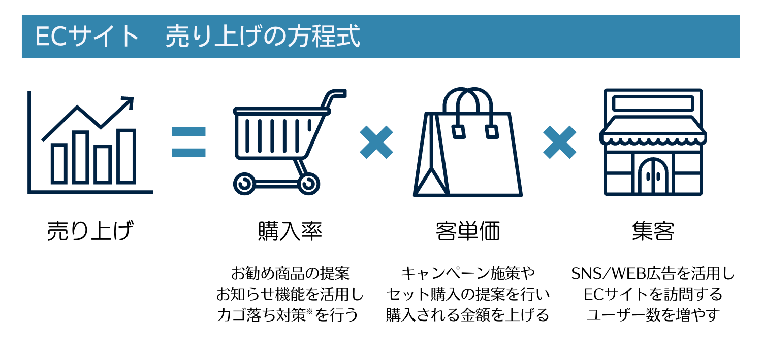 ECサイトにおける売上は購入率×客単価×集客(訪問者数)で決まります。