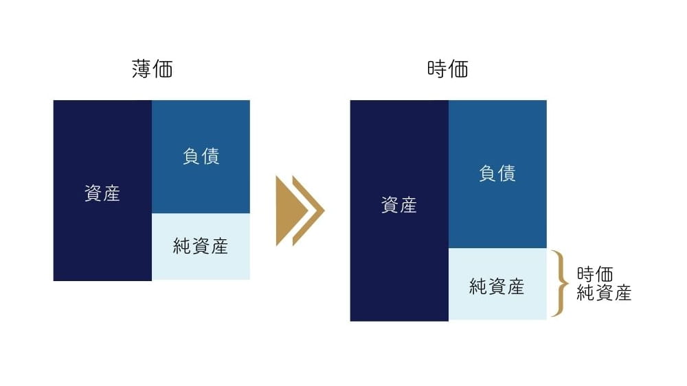 上記科目はあくまで金額の変動が大きくなりがちな代表例ですが、このような修正を行い、『時価純資産額』を算出します。